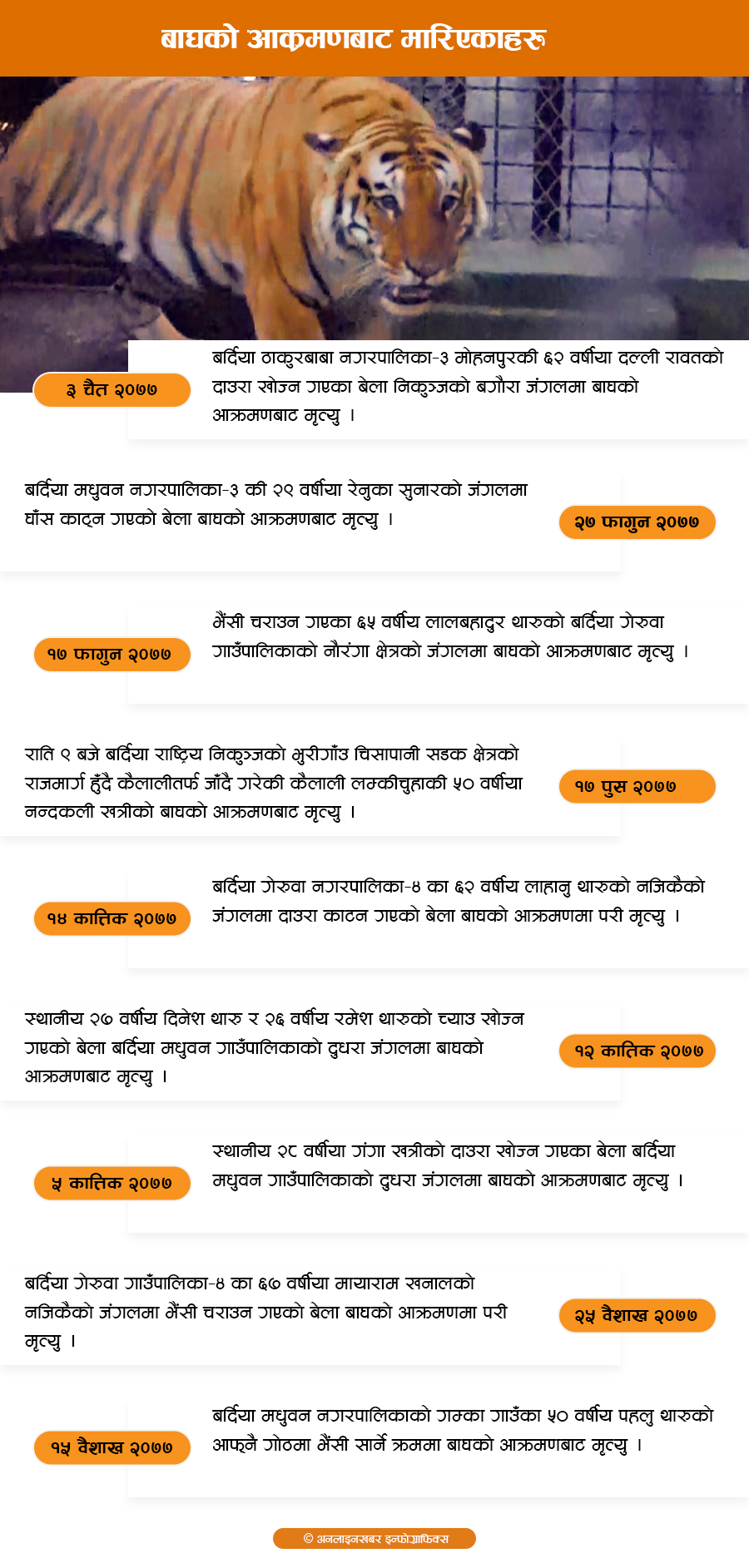 पछिल्लो एक वर्षमा बर्दिया राष्ट्रिय निकुञ्जको नजिकका बस्तीहरूमा बाघको आक्रमण बढ्दै गएको छ । २०७७ वैशाखदेखि चैत १९ गतेसम्म बर्दिया राष्ट्रिय निकुञ्जको विभिन्न क्षेत्रमा बाघको आक्रमणबाट १० जनाको मृत्यु भई सकेको छ भने ८ जना घाइते भएका छन् ।